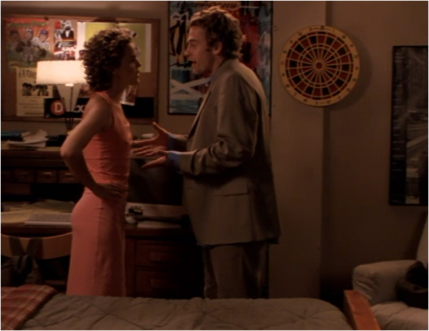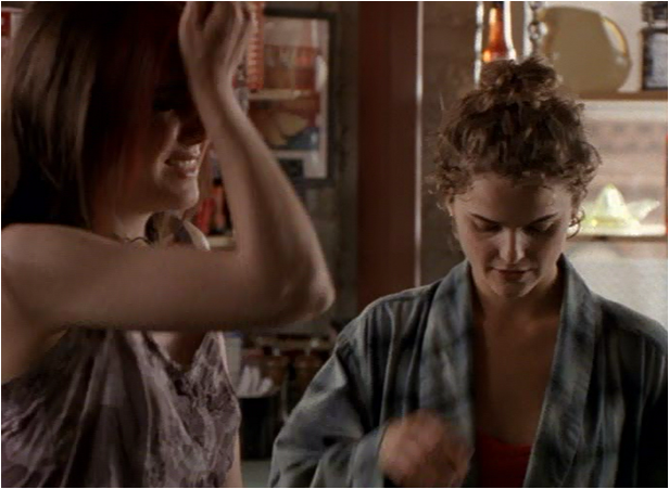 Speaking of fashion: Felicity’s morning hair topknot is awful and she should check that at the door before Ben sees her and dumps her for it. The short hair isn’t inherently bad. In fact, there have been times where it was downright cute. But this growing out phase is not good. It gets worse during junior year, just look at the boxed set.